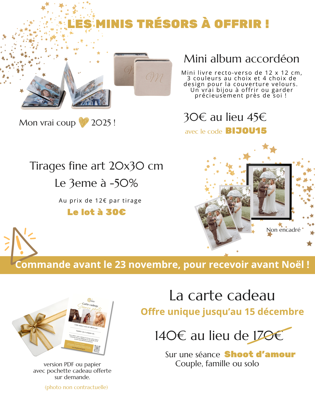 Les packs sont soit disponibles dans votre galerie si toujours active, soit sur demande vous m’envoyez les photos que vous souhaitez faire imprimer et je vous prépare une commande.